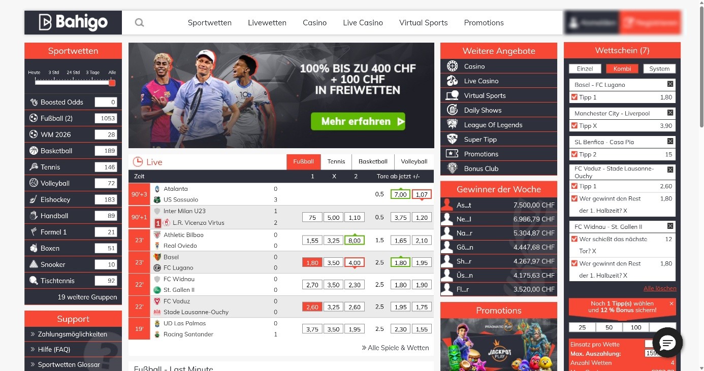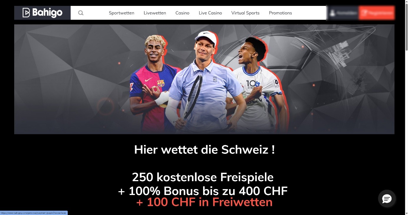 Für Neukunden gibt es eine lukratives Willkommenspaket beim Buchmacher Bahigo. Für die erste Einzahlung erhältst Du einen 100 % Bonus bis 400 CHF. Den Bonus musst Du bei der ersten Einzahlung auswählen. Du hast die Wahl zwischen einem Sportwetten-Bonus und einem Casino-Bonus.