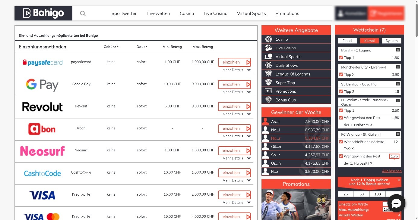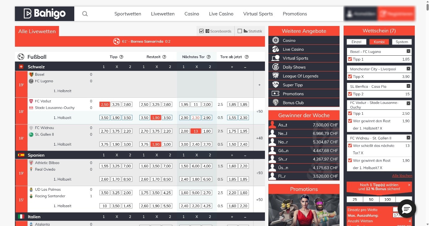 Livestreams haben wir bei Bahigo nicht gesehen. Wenn Du beispielsweise Schweizer Fussball mit Livewetten verknüpfen willst, gibt es aber gute Möglichkeiten, Live-Übertragungen im Fernsehen oder auch bei anderen Dienstleistern als Streams zu nutzen.