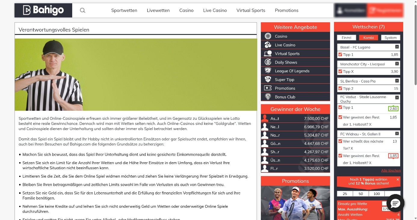 Für Fans von Schweizer Sportwetten bedeutet dies, dass der Spielerschutz solide, aber nicht auf dem höchsten Niveau ist. Eigenverantwortung ist deswegen ein wichtiges Thema bei der Nutzung dieses Buchmachers. Qualitativ ist das Angebot allerdings auf einem hohen Niveau, sodass es sich nach unseren Bahigo Erfahrungen lohnt, den Buchmacher näher unter die Lupe zu nehmen.