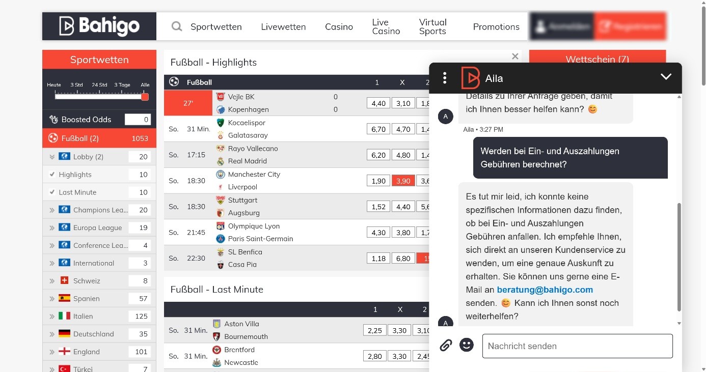 Der Kundenservice ist bei Bahigo per Live-Chat und E-Mail erreichbar. Bei unserem Test ist es uns allerdings nicht gelungen im Live-Chat echte Mitarbeiter zu finden. Das mag Zufall gewesen sein, aber definitiv ist der Kundenservice nicht rund um die Uhr live erreichbar. Das ist im internationalen Vergleich nicht optimal.