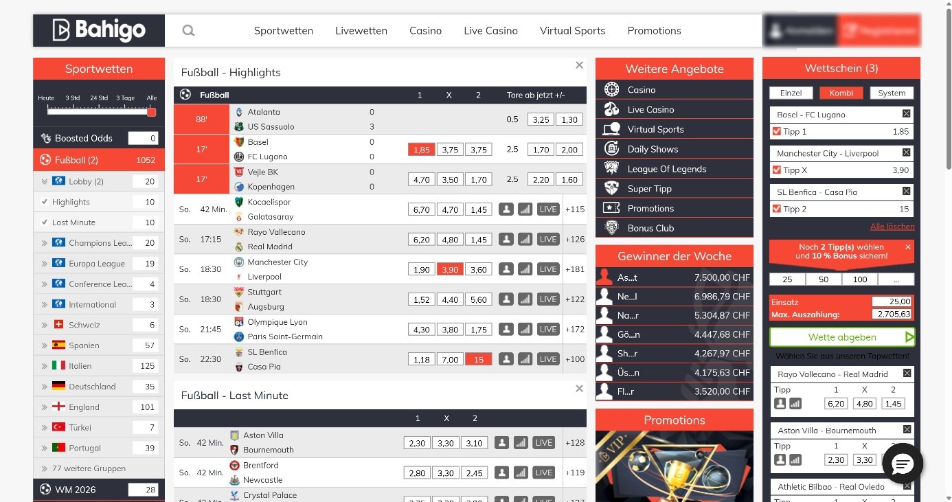 Bei Bahigo stehen euch über 30 Sportarten zur Verfügung. Fussball dominiert das Geschehen. Der Schweizer Fussball ist mit der Super League vertreten. Neben Wetten auf den aktuellen Spieltag stehen dir auch Langzeitwetten auf den Meister, internationale Wettbewerbe zur Verfügung.