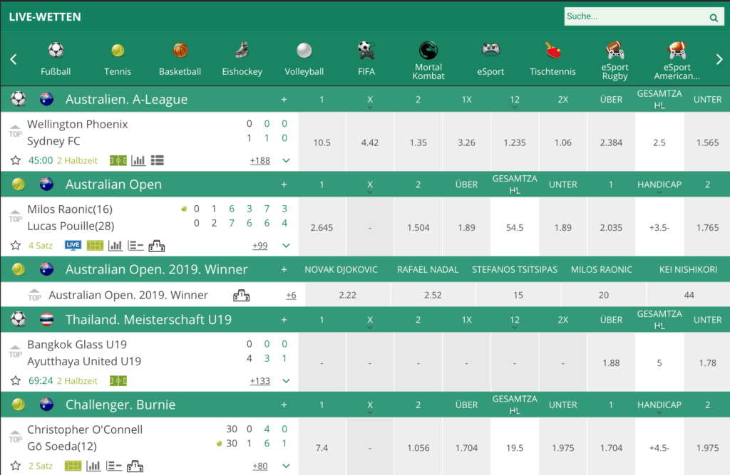 Auch bei den Livewetten ist der Anbieter BetWinner ziemlich gut und breit aufgestellt. Der Buchmacher wartet auch bei den Livewetten mit einem großen Fußballangebot auf. Pro Spiel ist die Zahl der Wettmärkte sehr hoch verglichen mit vielen anderen Wettanbietern. Ihr könnt selbst in der australischen A-League pro Spiel aus mehr als 250 Ereignissen eure Tipps zusammenstellen.