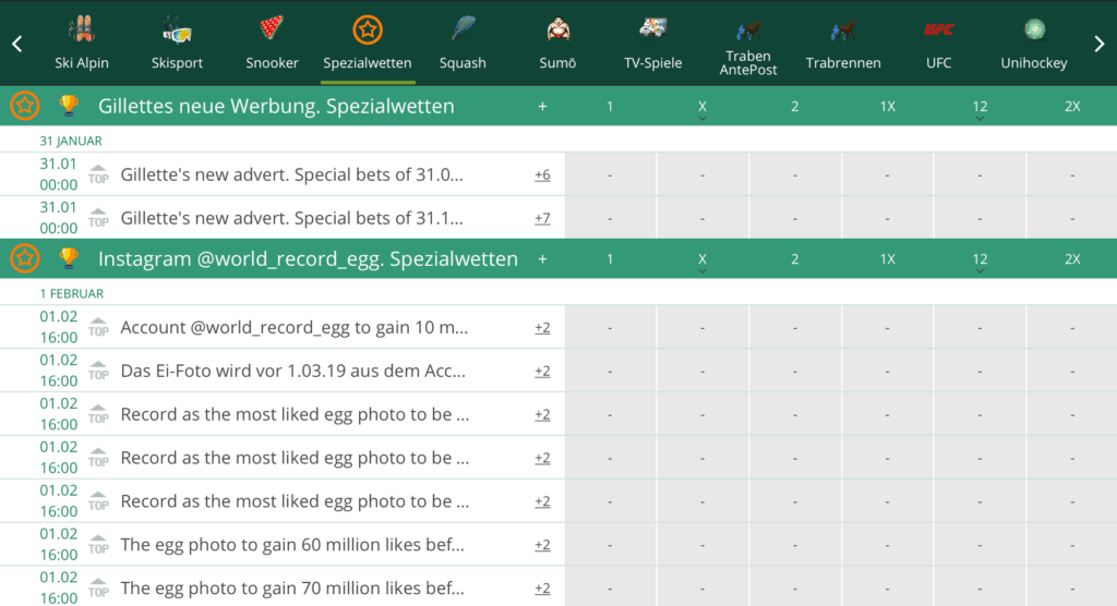 Doch das ist noch längst nicht alles, denn bei BetWinner könnt ihr auch auf etliche weitere Events wetten: Politik zum Beispiel. Ihr könnt bei BetWinner sogar auf das Wetter wetten oder darauf, wie viele Likes und Dislikes der nächste Gilette Werbespot auf Youtube haben wird oder wie viele Likes das Ei-Foto auf Instagram bekommen wird.