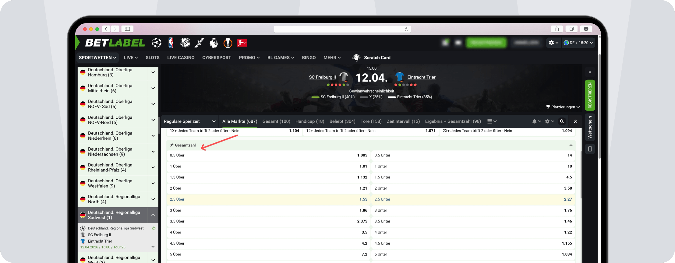 Betlabel ist der beste Buchmacher für Regionalliga Wetten, denn bei diesem Buchmacher wird der deutsche Amateurfußball auf absolutem Top-Niveau berücksichtigt. Für jedes Spiel der Regionalliga findest du über 800 Wettmärkte, für Top-Spiele teilweise sogar noch deutlich mehr.