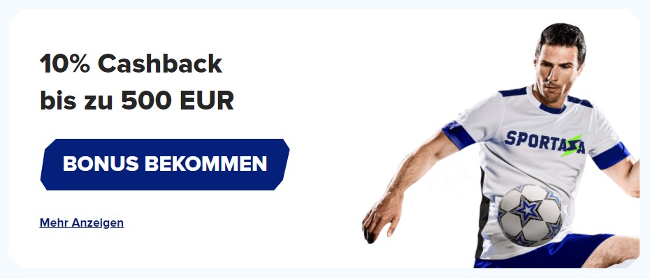 Zum regelmäßigen Sportaza Bonus zählen verschiedene Aktionen, die im Grunde alles Wichtige abdecken: Spätere Einzahlungen werden zu 50 % mit einem Reload-Bonus bis zu 500 Euro belohnt. Am Wochenende wartet eine Gratiswette bis zu 500 Euro, und die gleiche Summe kann als zu 10 % anrechenbares Cashback zurückgeholt werden.