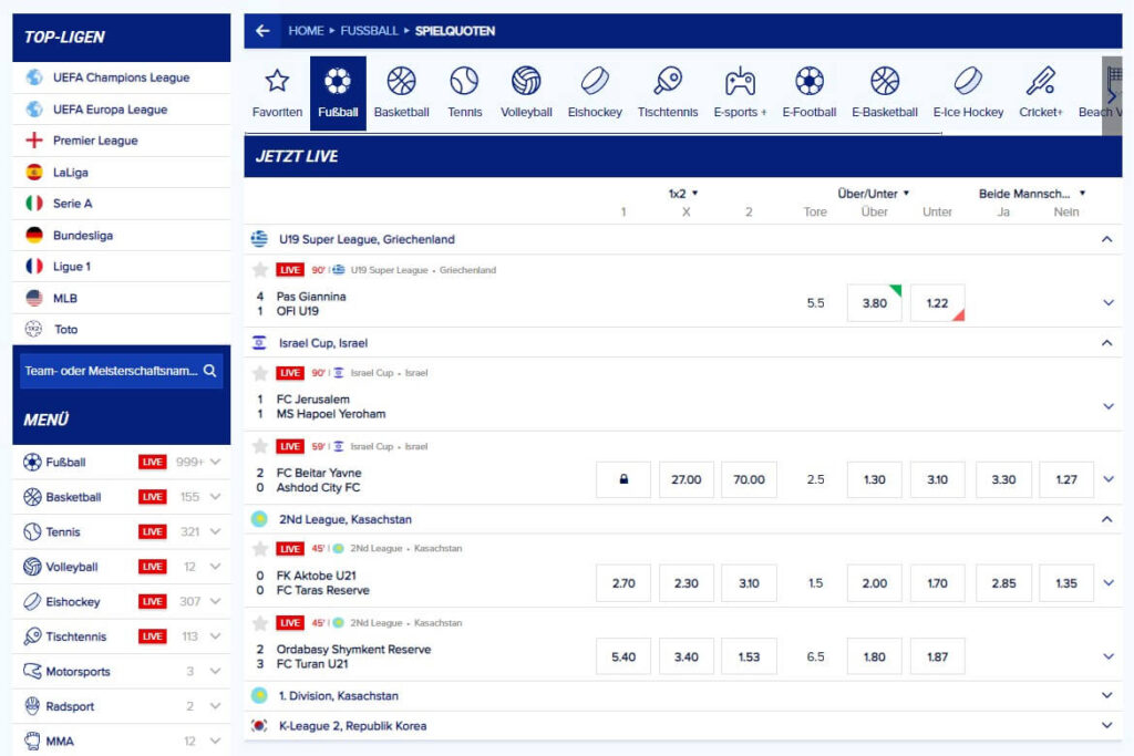 Pro Bundesligapaarung (oder auch in den großen Wettbewerben Englands, Spaniens oder der UEFA) stehen bis zu 300 Wettmärkte zur Auswahl. Da geht sicherlich noch so manches mehr, aber für Wettneulinge ist das Anlass genug, nicht sofort die Übersicht zu verlieren. Prematch sind die Optionen dabei noch etwas zurückhaltender mit vielen Tor- und Ergebniswetten, im Live-Segment geht es dann aber variabler zur Sache.