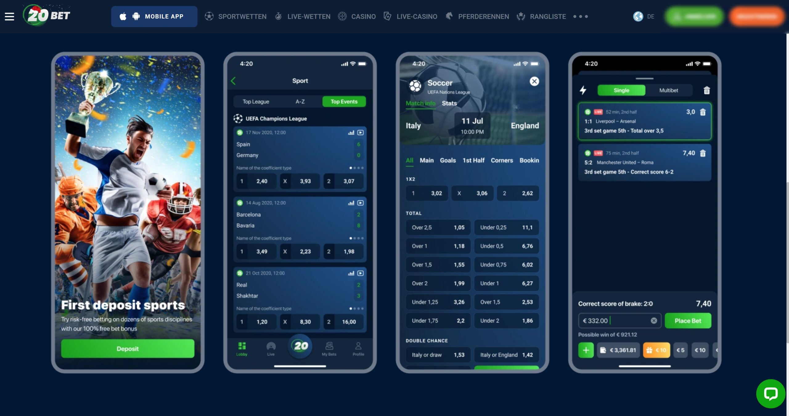 Bei unserem Praxistest haben sich alle drei Varianten auf höchstem Niveau bewährt. Zwar haben mittlerweile alle Top-Buchmacher in unserem Vergleich erstklassige Apps. Aber 20Bet setzt in diesem Bereich Massstäbe und bekommt deswegen von uns die Auszeichnung als Testsieger in der Kategorie Mobile App.