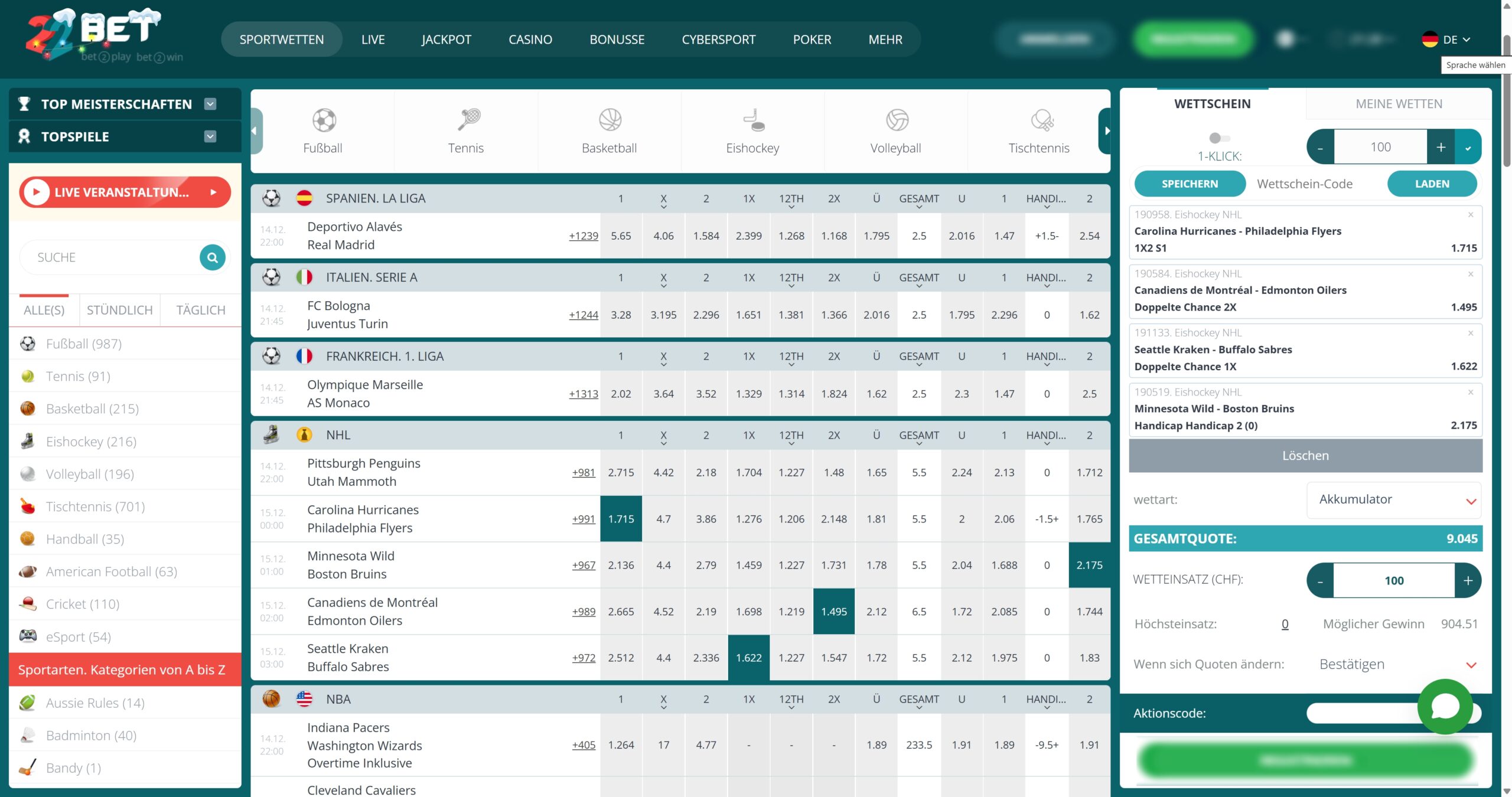 Mit über 35 Sportarten ist das Wettangebot von 22bet in der Breite exzellent aufgestellt. Bei Top-Events wie Spielen der UEFA Champions League kannst du regelmässig deutlich mehr als 1000 Wettmärkte nutzen.