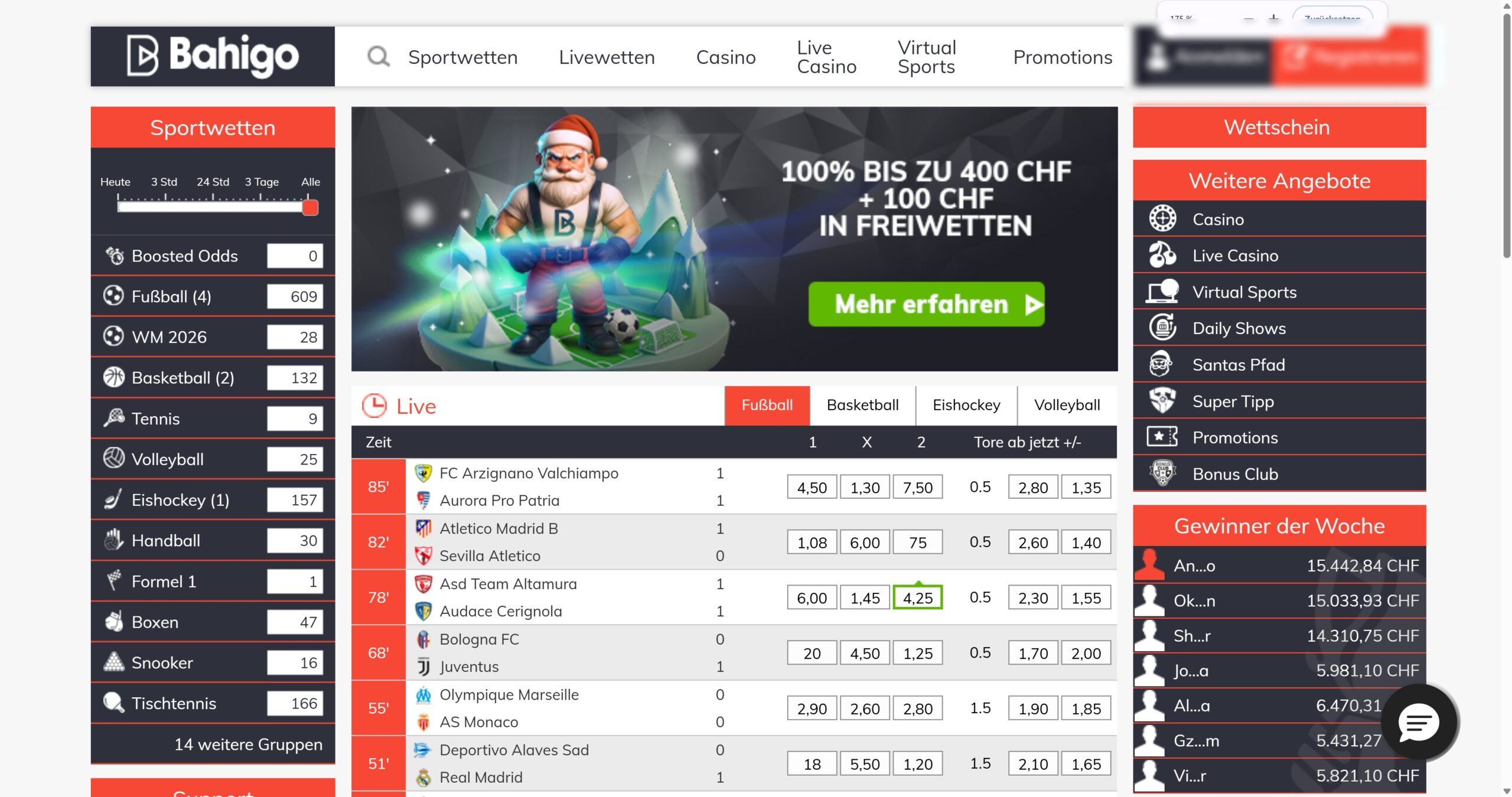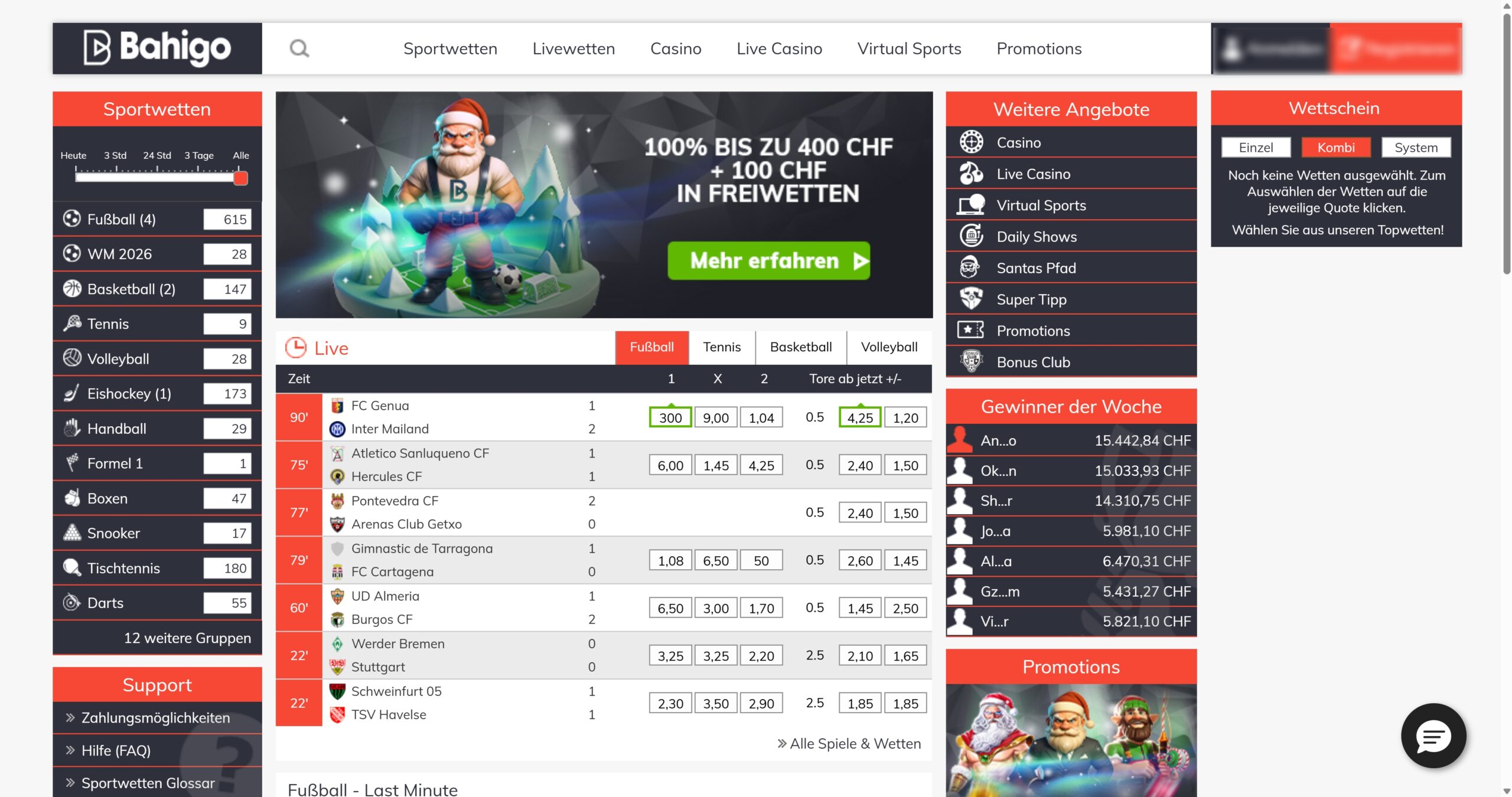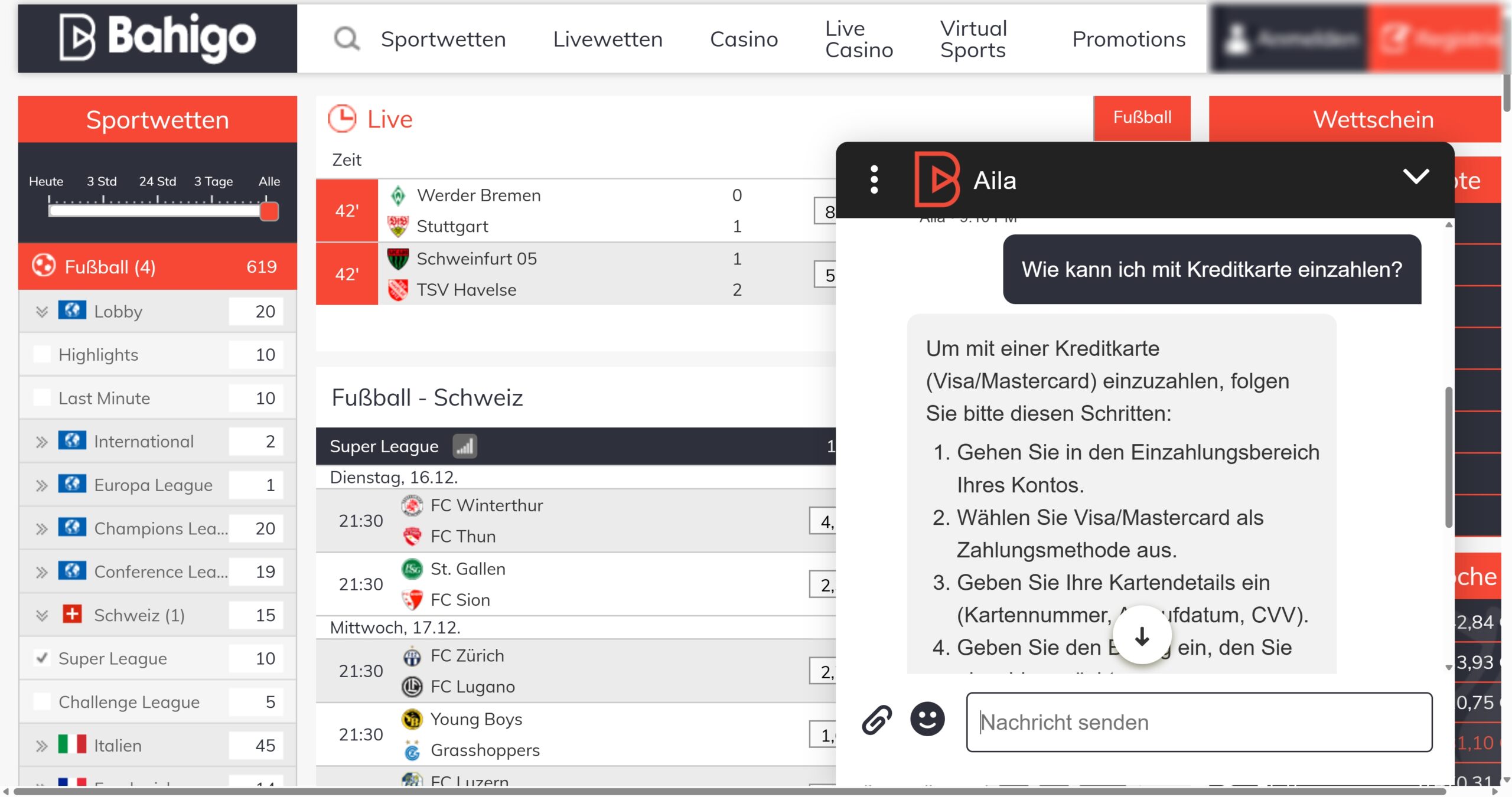 Es gibt sogar virtuellen Sport im Programm, sodass du deine Sportwetten in der Schweiz nicht nur auf echten Sport platzieren kannst. Der zuverlässige Kundensupport auf Deutsch funktioniert nach unseren Erfahrungen einwandfrei. Das attraktive Casino rundet das insgesamt gelungene Angebot ab. Für uns ist Bahigo klar und deutlich der Testsieger unter den Buchmachern in der Schweiz.