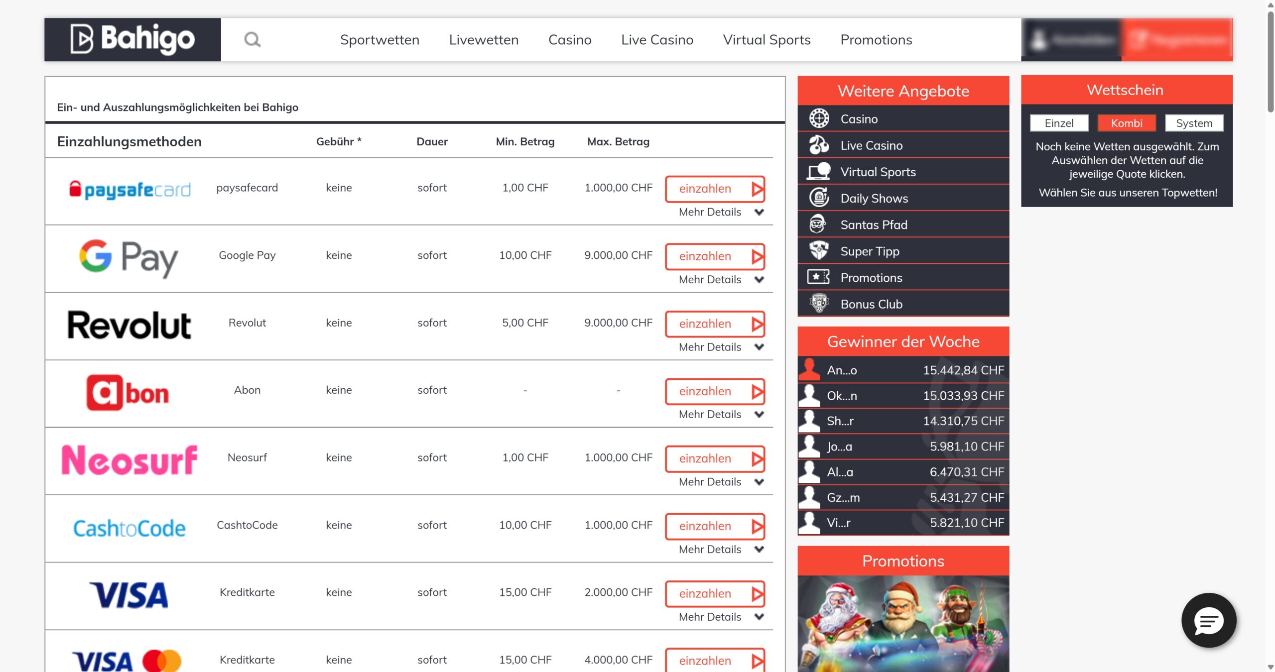 Bahigo hat eine exzellente Auswahl an Zahlungsmethoden. Apple Pay, Neosurf, Paysafecard, CashToCode, MiFinity, Skrill, Neteller, VISA und Mastercard sind einige der beliebtesten Zahlungsmethoden für Sportwetten in der Schweiz. Dazu kannst du alle gängigen Kryptowährungen bei Bahigo nutzen, etwa Bitcoin, Ethereum, Ripple, Tether und Litecoin.