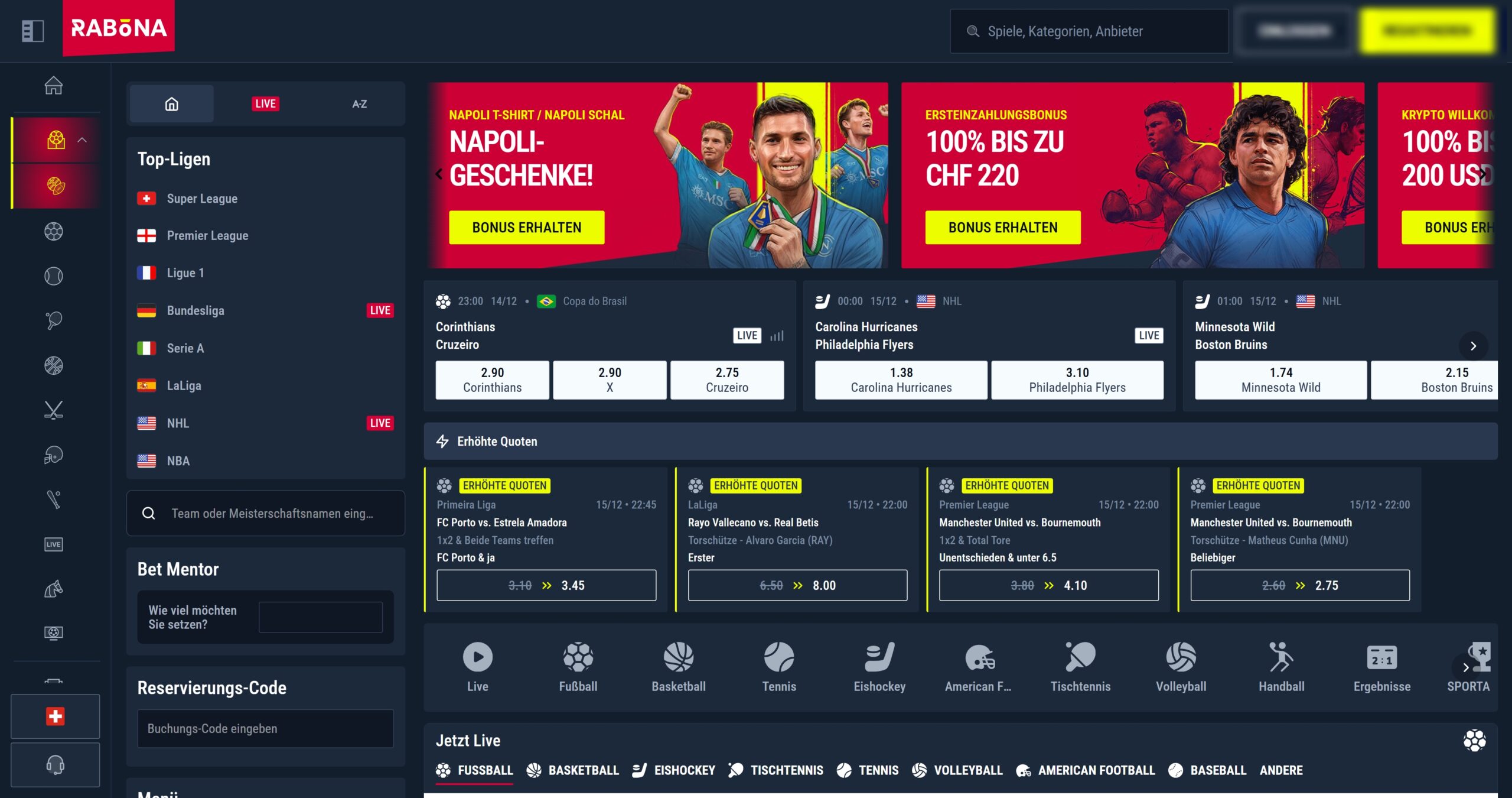 Rabona hat einen modernen Look, der allerdings nicht am häufig zu sehenden Info-Überschuss leidet. Vielmehr werden die wichtigen Inhalte sinnvoll strukturiert präsentiert. Wenn du eine bestimmte Sportart oder einen Wettmarkt suchst, kannst du dich intuitiv orientieren. Die hochwertigen Grafikelemente verschaffen der Website einen äusserst professionellen Look.