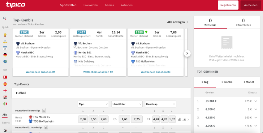 - Starkes Fussball-Wettangebot mit breiter Abdeckung von Bundesliga, 2. Liga, internationalen Top-Ligen und vielen Spezialmärkten